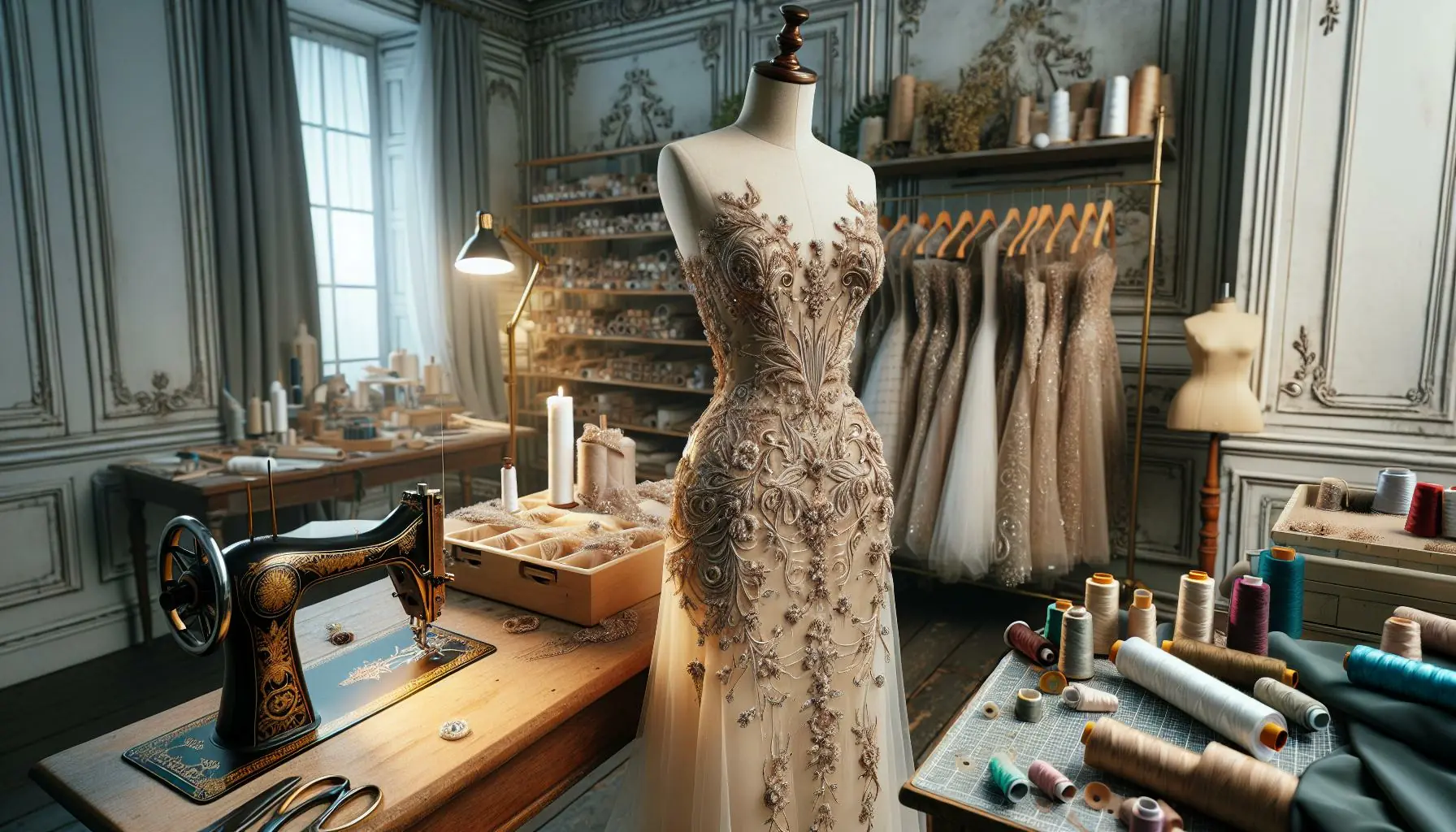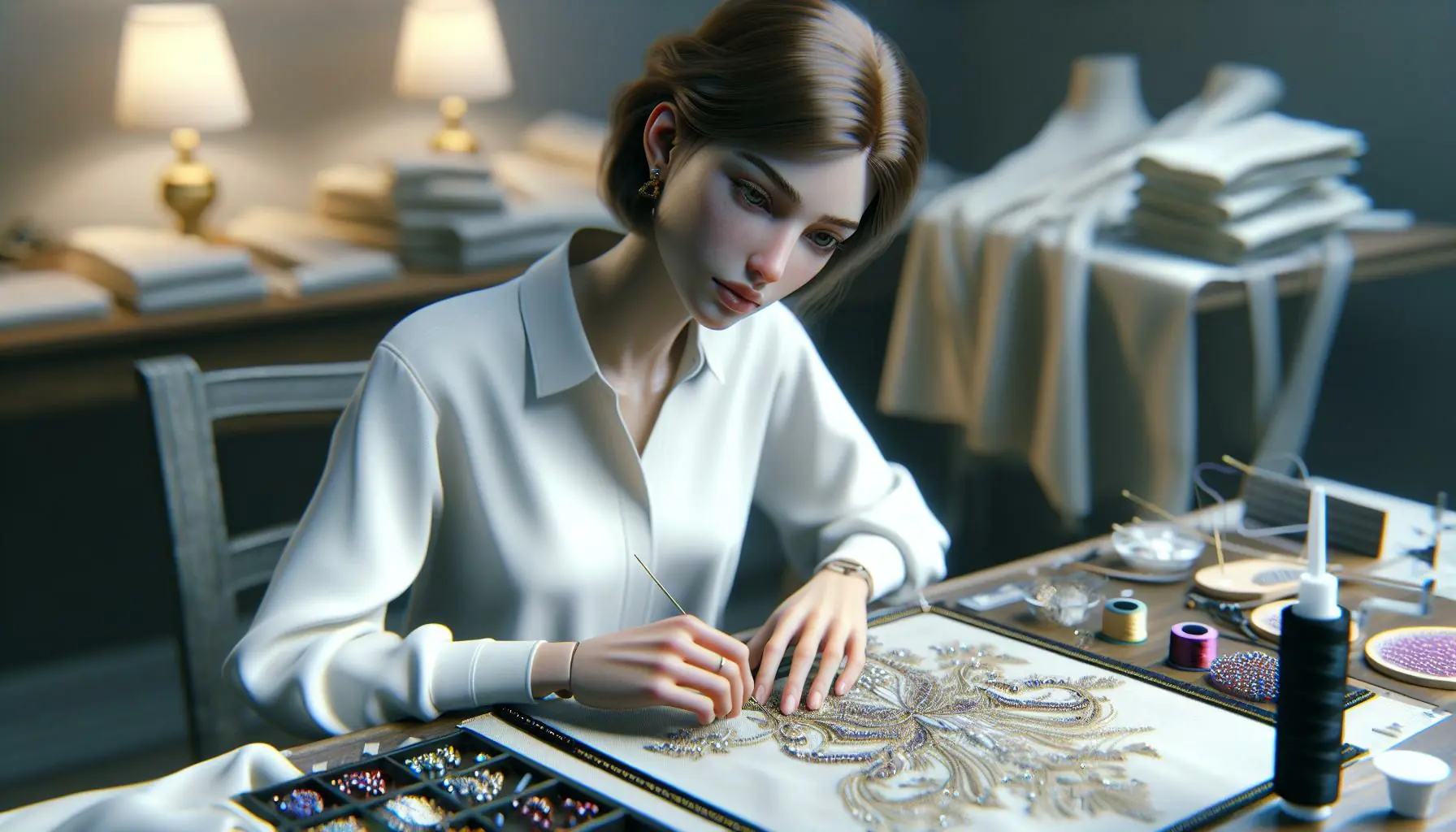 - Broderie: Hand-embroidering intricate patterns using beads, sequins, crystals